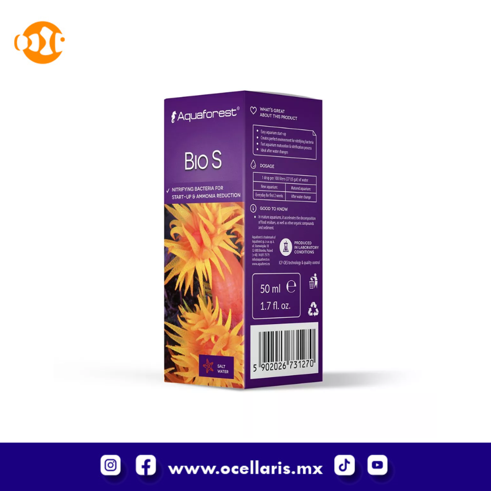 Dosis: 1 gota por 100 litros de agua todos los días durante las 2 primeras semanas. En los acuarios en funcionamiento, Bio S debe usarse después de los cambios de agua. Agitar antes de usar.
