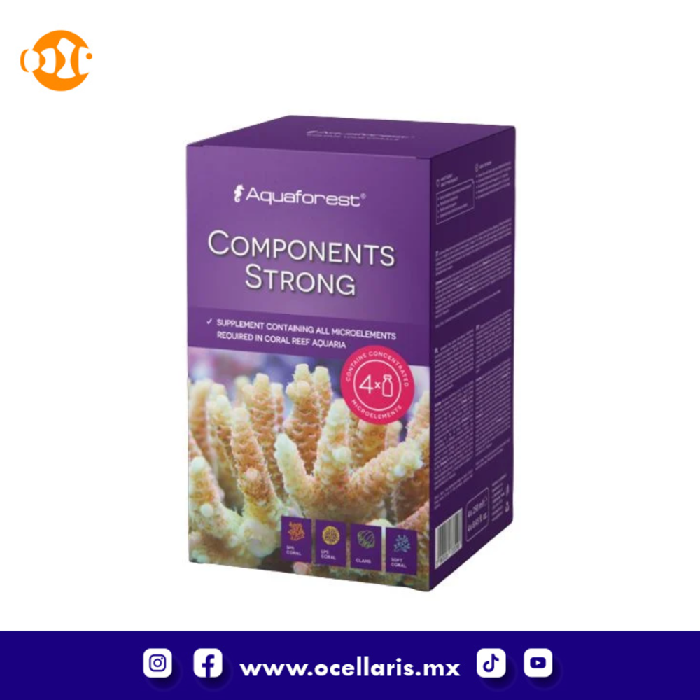 Components Strong es un conjunto concentrado de oligoelementos destinado a su uso en acuarios de arrecife utilizando el Método Balling. Cuando se usa en combinación con Calcium, Magnesium, KH Buffer y Reef Mineral Salt; Components Strong de Aquaforest proporcionan la cantidad perfecta de microelementos necesarios para mantener el equilibrio adecuado* en los acuarios de arrecife de coral.
