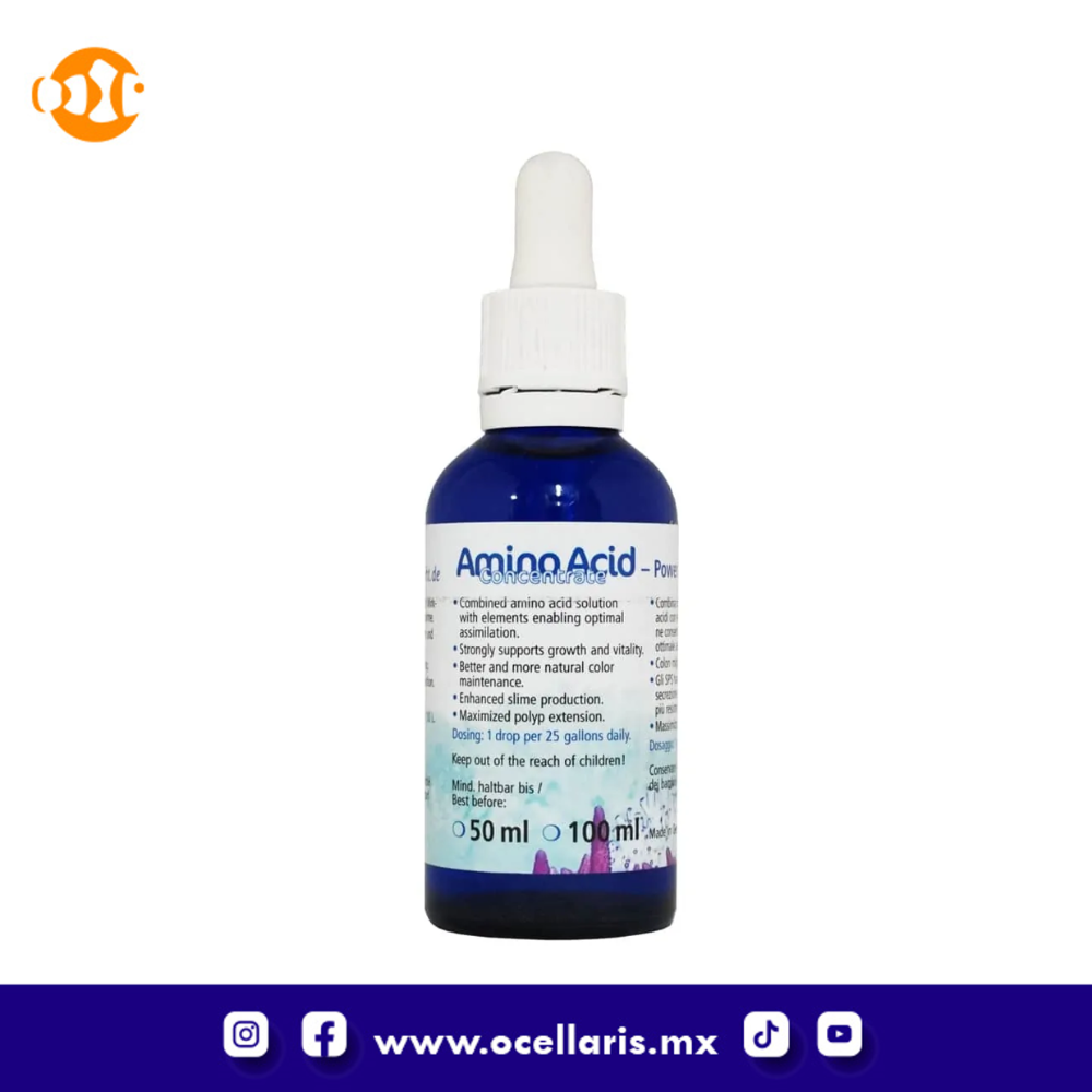 La dosis diaria recomendada es de 1 gota por cada 25 galones (100 Litros). Al igual que con la dosificación de la mayoría de los aminoácidos, es difícil una sobredosis de una manera que pueda dañar a los corales, pero la sobredosis puede provocar un aumento de las algas mucilaginosas pardas (cianobacteria). Si nota esto, disminuya la dosis a 1/3 hasta que se disipe el alga.