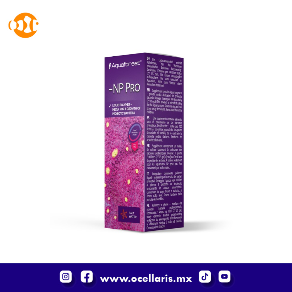 -NP Pro es un medio para bacterias probióticas diseñado para acuarios de arrecife (Pro Bio S). El producto contiene polímeros líquidos biodegradables, que son una excelente fuente de carbono para las bacterias probióticas. -NP Pro afecta positivamente la distribución de masa orgánica y reduce los NO3 y PO4 no deseados en el agua del acuario. A diferencia de los polímeros típicos, -NP Pro, como la única formulación disponible en el mercado, no requiere el uso de filtros de flujo especializados.