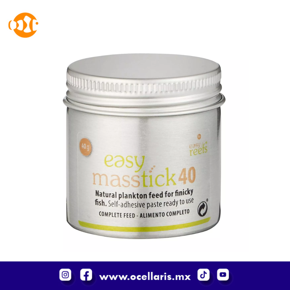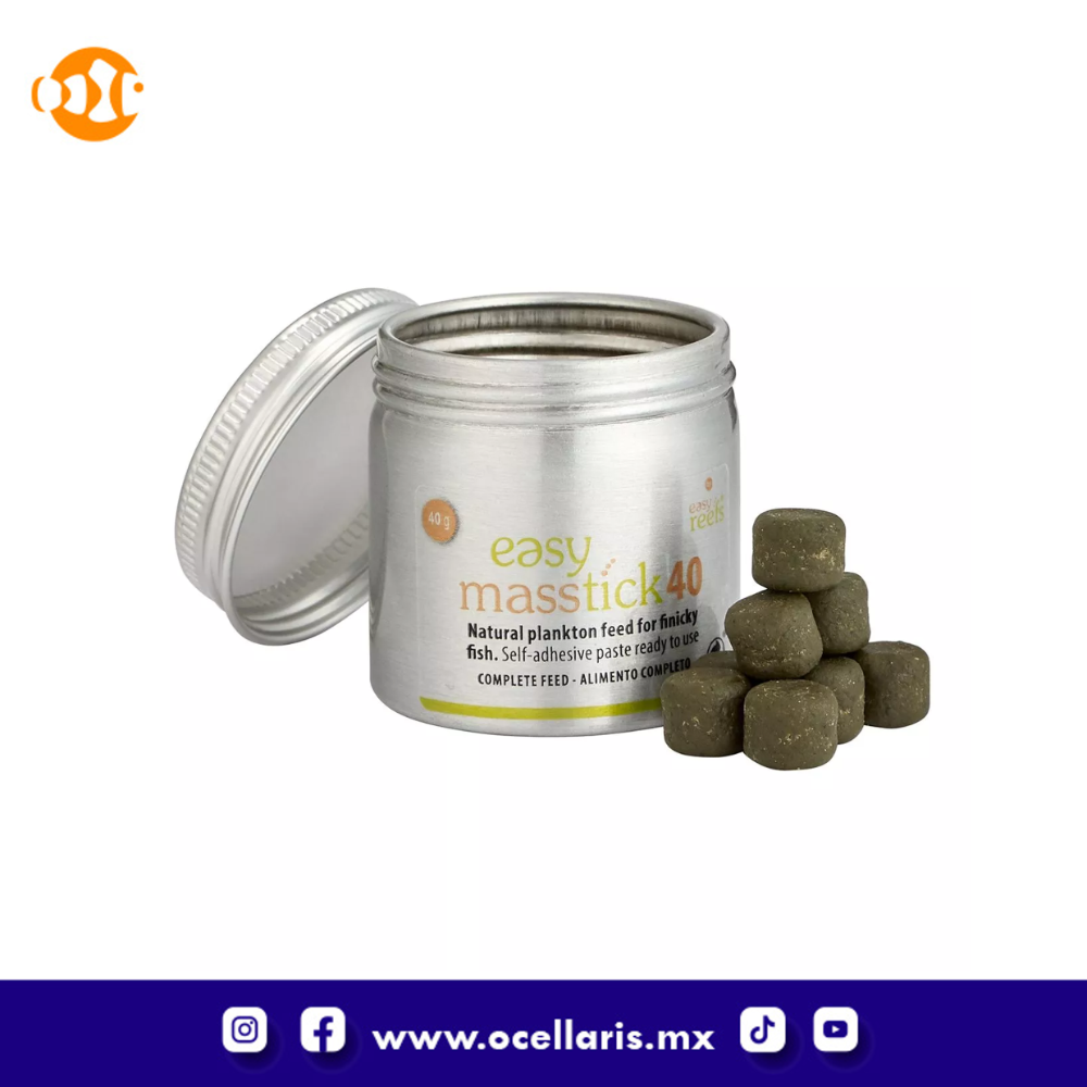 Easy Reefs Masstick40 Ready Fish Food es un innovador alimento para peces que puedes pegar en cualquier superficie de tu acuario, por ejemplo, en tu vaso o rocas, para que los peces puedan pastar en él de forma natural. Los aficionados eligen Masstick porque es totalmente natural y nutricionalmente equilibrado. A los peces quisquillosos les encanta. A diferencia del Masstick original, viene listo para usar; No se requiere preparación.