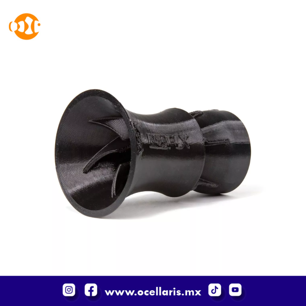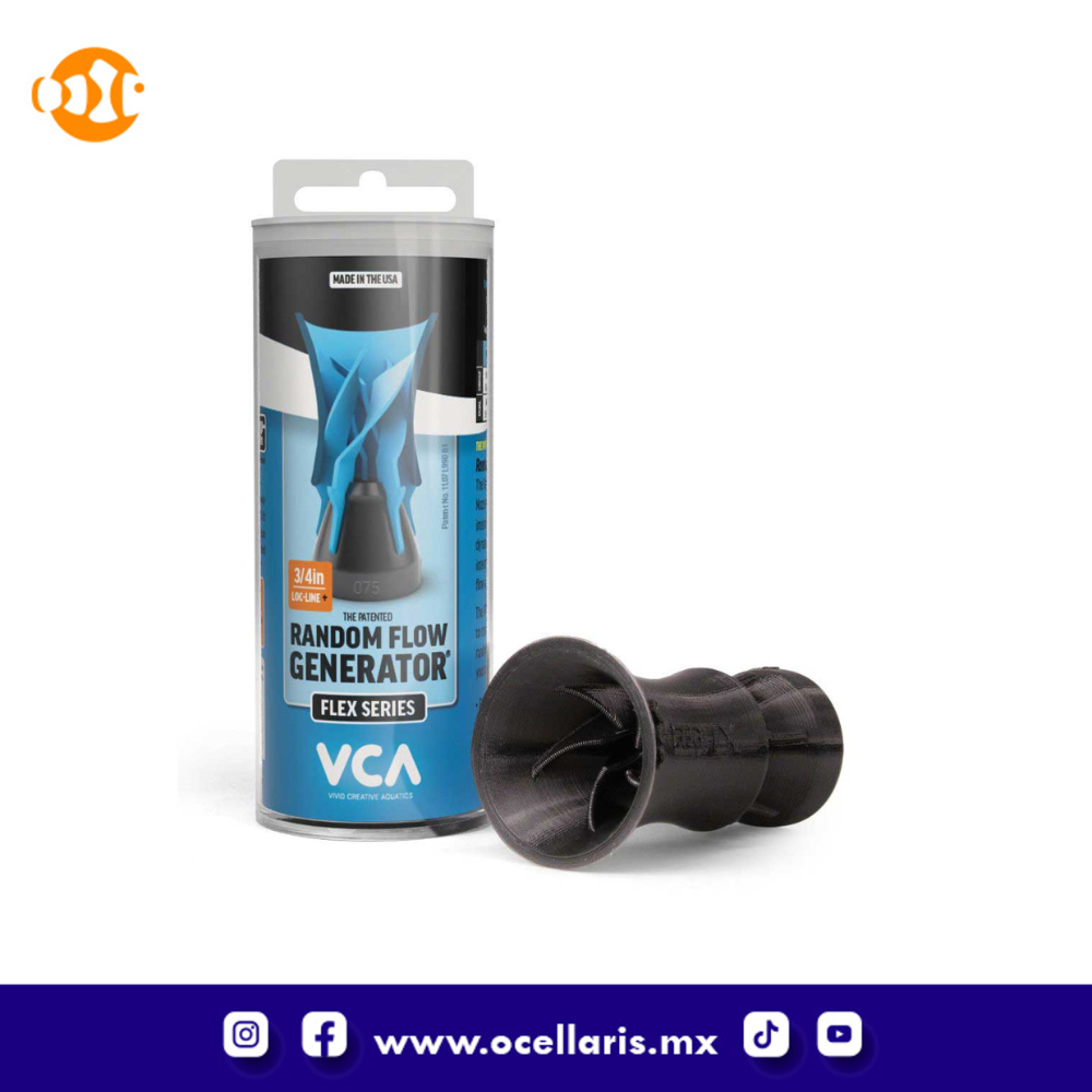 La serie Flex mantiene el revolucionario diseño RFG de Vivid Creative Aquatics que utiliza dinámica de fluidos para variar aleatoriamente la intensidad y dirección del flujo de agua cuando sale de la boquilla. Un conjunto de 5 aletas en espiral canalizan el agua desde una dirección y luego sale de la boquilla en una dirección diferente. La pequeña cantidad de interferencia en la base del eductor ayuda a crear un cambio aleatorio en la entrada que afecta la ruta del flujo que sale de la boquilla, creando un patrón de flujo aleatorio más natural en el acuario.