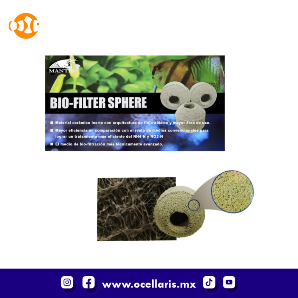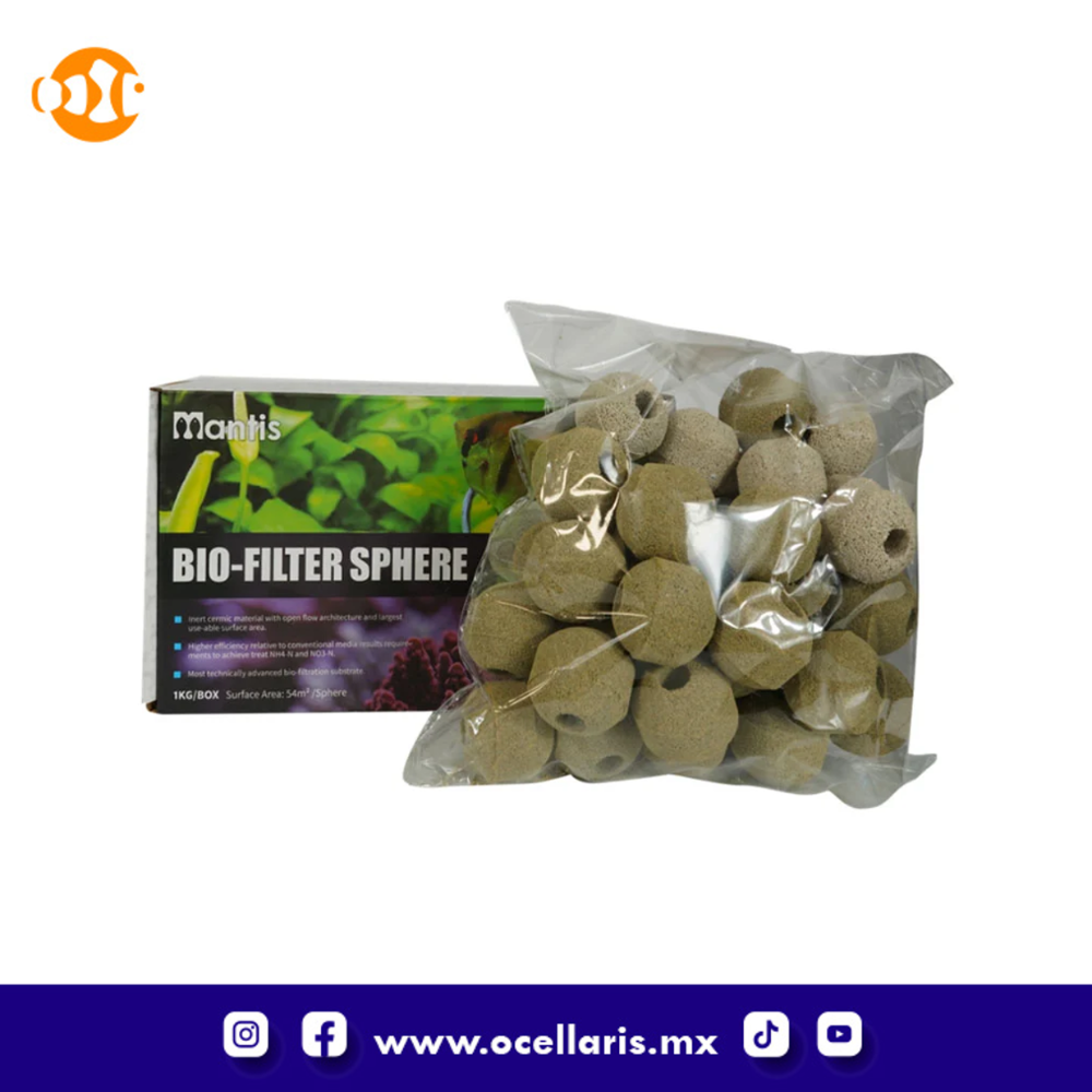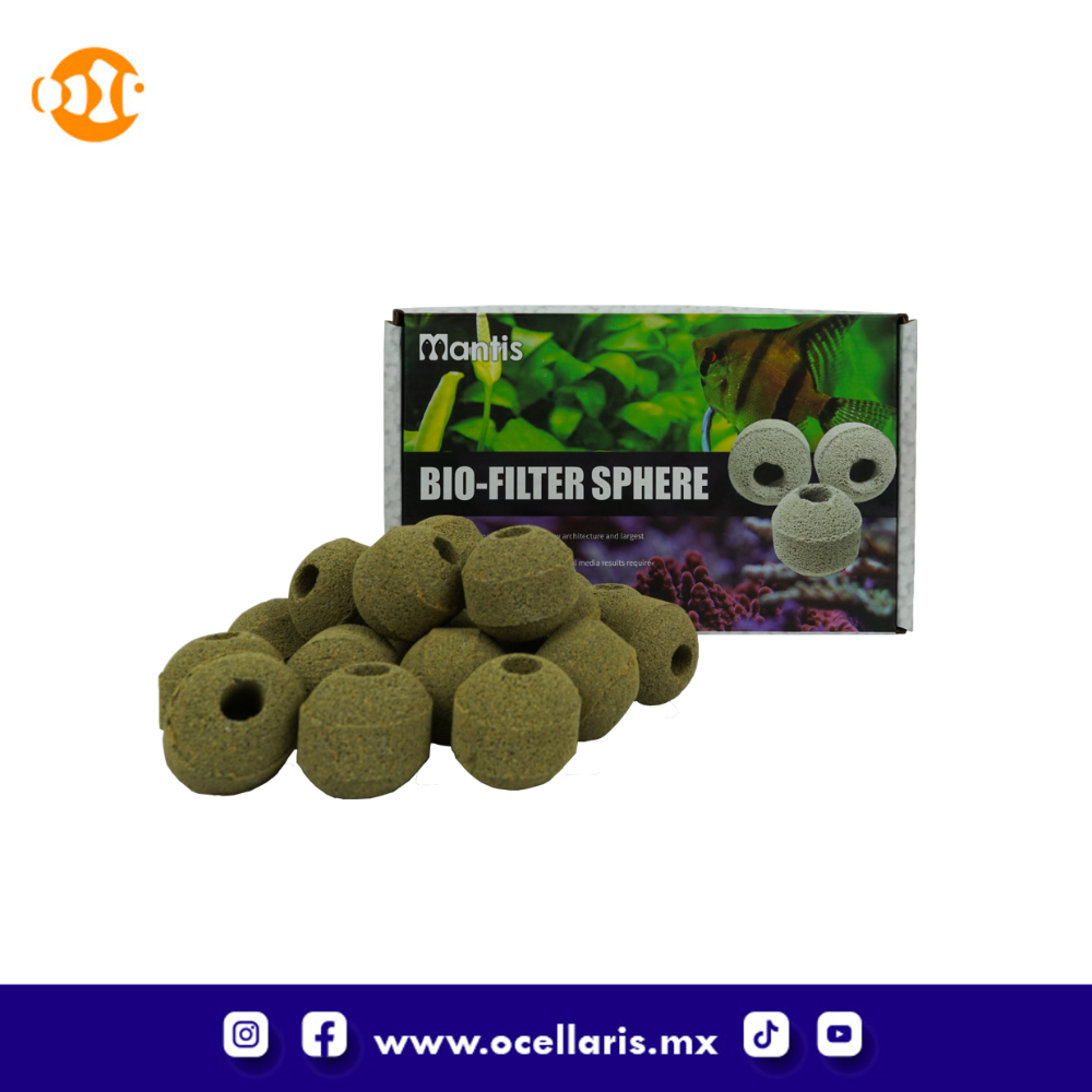 Las bioesferas nanotecnológicas de Mantis se crean utilizando tecnología de tratamiento de aguas residuales microbianas estabilizadas con filtro aireado biológico (W-BAF). Esta tecnología patentada se forma en perlas de cerámica inertes que se pueden colocar en una bolsa de malla y arrojar a su sump o compartimiento de filtro para la filtración del acuario. Cada esfera tiene un área de superficie ultra alta de 580 pies cuadrados, proporcionando un amplio espacio para la colonización por cepas de bacterias beneficiosas que pueden trabajar para reducir los nitritos, nitratos y amoníaco de forma natural.