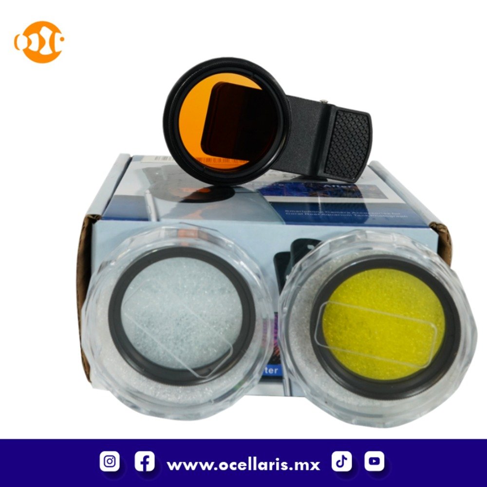Este completo kit incluye tres filtros intercambiables y apilables: un filtro naranja que mejora los tonos cálidos y resalta los colores de los peces y corales; un filtro amarillo ideal para capturar la luminosidad y la nitidez; y un filtro de aumento que permite acercarse a los detalles más pequeños y capturar imágenes profesionales de los habitantes marinos.