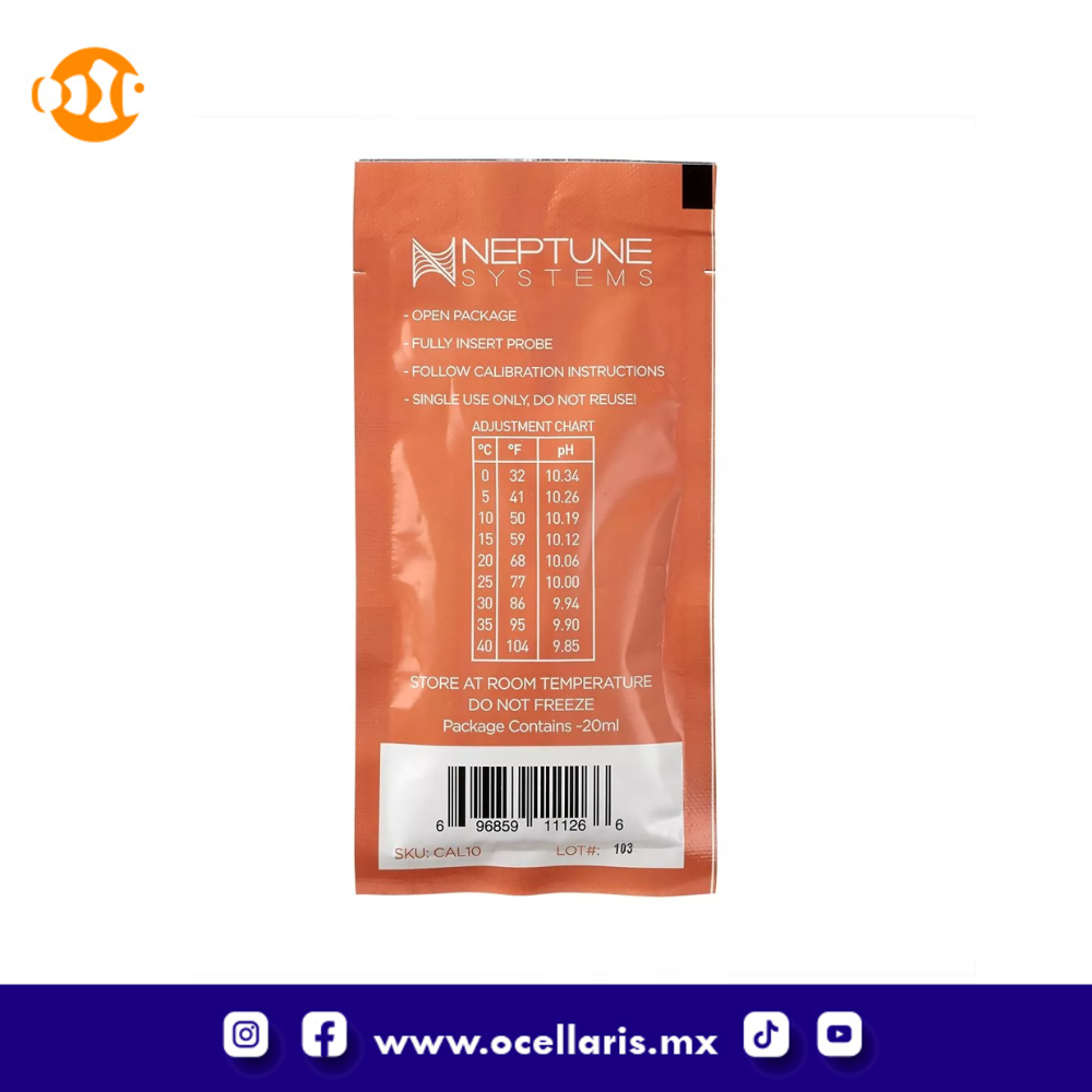 Los paquetes de calibración de pH de un solo uso de Neptune Systems hacen que calibrar su sonda de pH sea simple y rápida. Simplemente abra la parte superior e introduzca la sonda en la solución cuando realice el procedimiento de calibración.