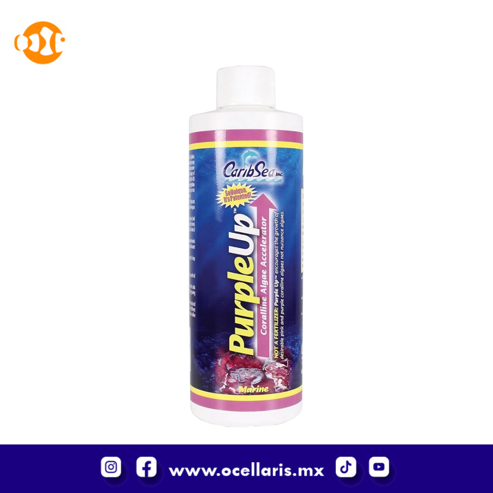 PurpleUp™: utiliza un enfoque único de método dual para la aceleración de las algas coralinas. Contiene calcio iónico; que eleva inmediatamente los niveles de calcio disuelto en el agua de su acuario. Al mismo tiempo, Super Sea Calcium™ (un polvo de aragonito de 10 micras derivado del agua de mar natural) se dirige a la superficie de la roca viva. Esta se disuelve in situ; entregando calcio, estroncio, magnesio y carbonato justo donde se necesita. PurpleUp™ también repone el yodo; un elemento esencial para los tejidos de algas coralinas que rápidamente se agota en sistemas cerrados. PurpleUp™ no es un fertilizante, no promueve el crecimiento de algas molestas.
