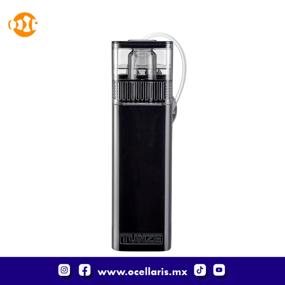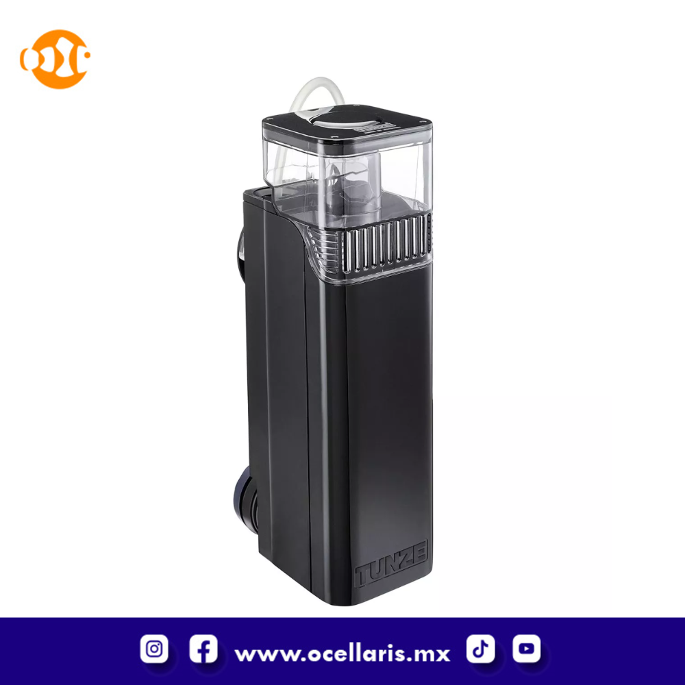 El espumador TUNZE® genera grandes volúmenes de burbujas de aire finas con un diámetro de .0039 a .011 pulg. (0,1 a 0,3 mm) En la superficie de las burbujas de aire, los contaminantes como proteínas, celulosa, células muertas, etc. se adsorben inmediatamente. La mezcla de agua / aire se expande y estabiliza en el reactor de la copa del skimmer, el agua regresa al acuario y las burbujas de aire cargadas de proteínas se derraman en la copa del skimmer. La cámara intermedia del sistema antiespumante patentado evita que el skimmer forme espuma excesiva y controla el rendimiento del skimmer, dependiendo del nivel del agua y la carga orgánica. Este principio de "desnatado rápido", en comparación con los grandes skimmers con un largo tiempo de contacto, se obtiene porque las sustancias adsorbidas por las burbujas de aire no se liberan nuevamente, por lo que no regresan al agua del acuario.